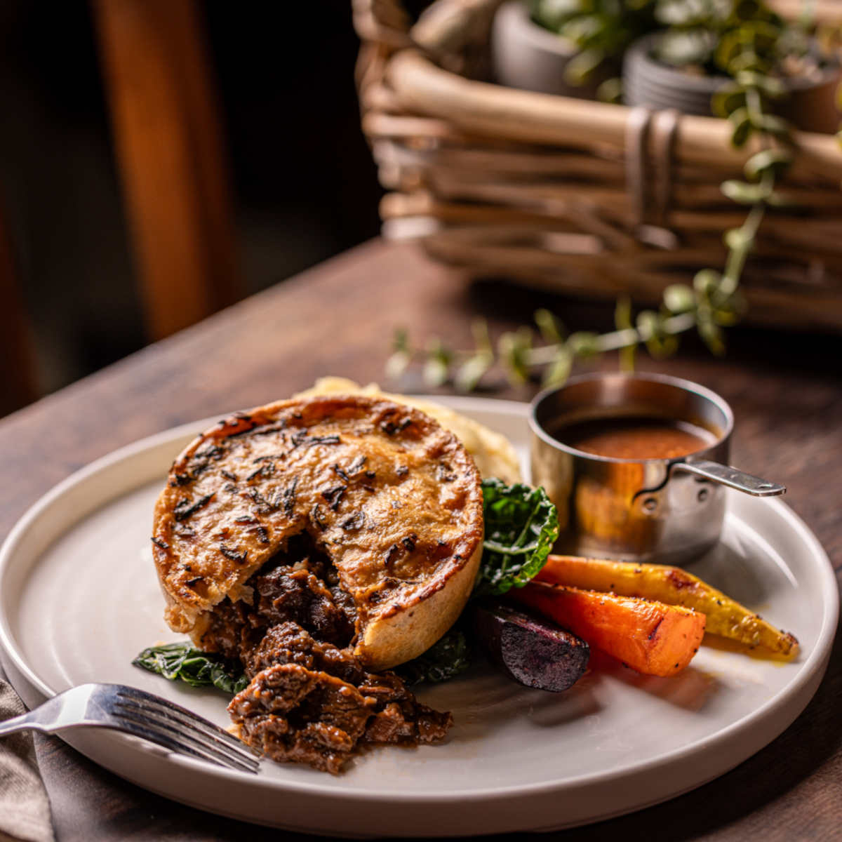 British, organic steak & ale pie, mash, roasted roots, buttered cavolo nero | 18 1107 kcals