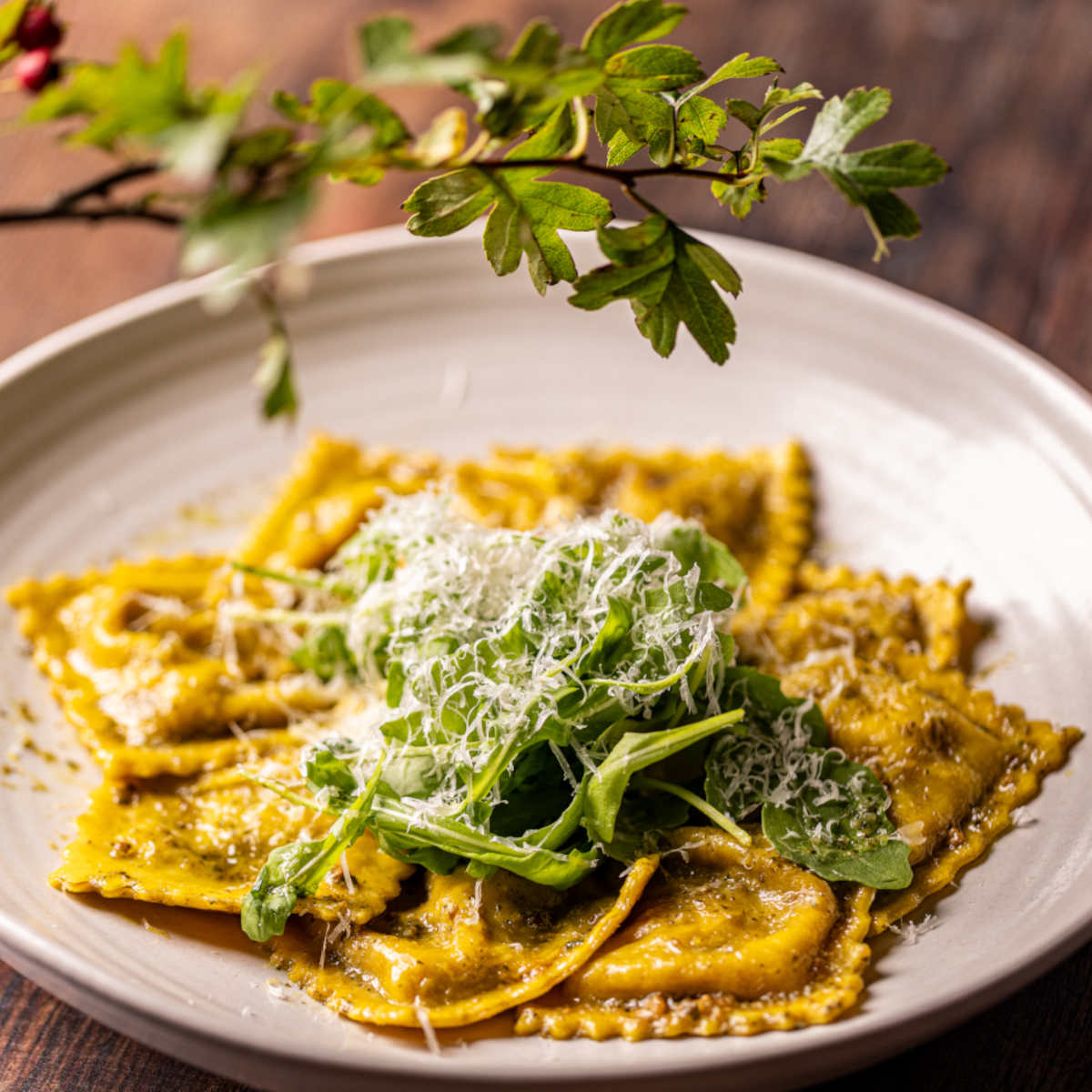 Somerset pork & fennel ravioli, brown butter, pesto | 17.5 573 kcals